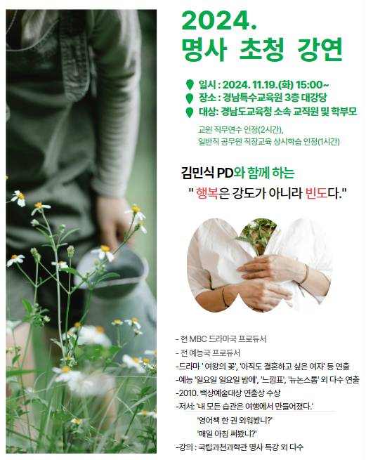 6.연수 신청(희망자) 1) 신청 방법: 경남교육 연수포털에서 수강신청(https://www.gneti.or.kr) 2) 신청 절차: 로그인 → 수강신청→ 경남특수교육원→ 2024. 명사 초청 강연회→ 신청하기→ 승인 완료 3) 신청 기간: 2024년 10월 8일 (화) - 10월 15일 (화) 18시 4) 대상자 확정: 수강신청 후 '승인' 알림 문자 확인 (신청 선착순 300명) 5) 대상자 알림: 2024년 10월 24일 (목) 예정(공문 게시)